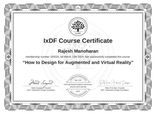 IxDF Course Certificates are awarded to Rajesh Manoharan in formal recognition of their coursework surpassing the rigorous benchmarks of exceptional performance established by the IxDF Educational Codex.