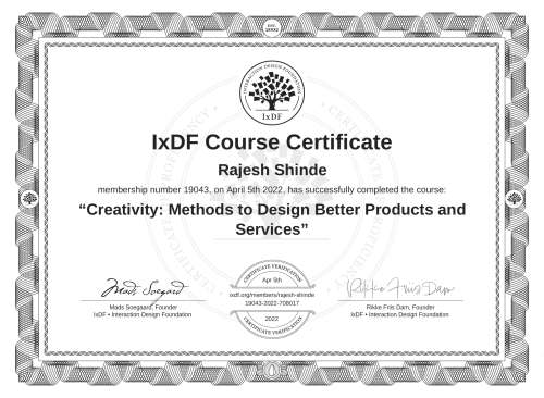 This IxDF Membership Certificate is issued to Rajesh Shinde in formal recognition of their membership of the IxDF, global leader in design education.