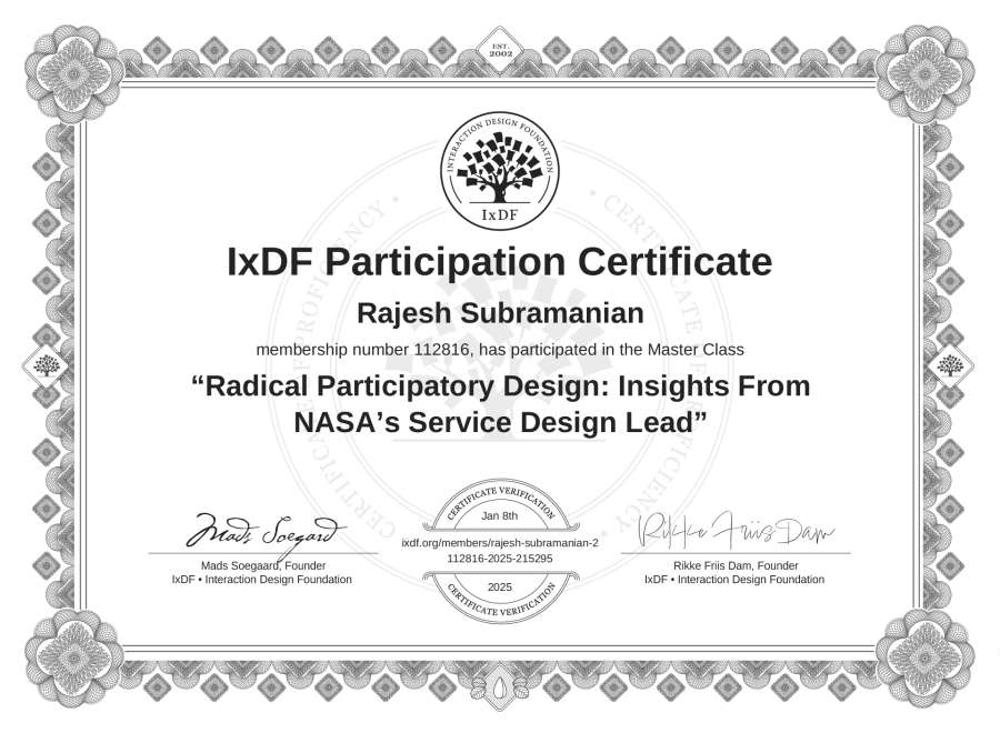 Rajesh Subramanian's IxDF Masterclass Certificate: Radical Participatory Design: Insights From NASA’s Service Design Lead
