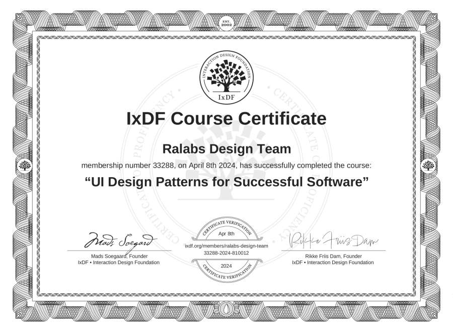Ralabs Design Team's IxDF Course Certificate: UI Design Patterns for Successful Software