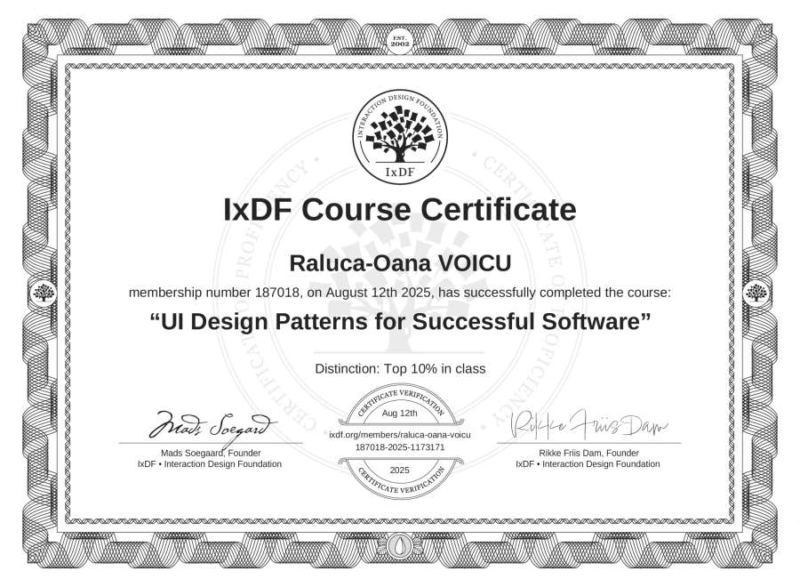The IxDF Course Certificate above is awarded to Raluca-Oana VOICU with a Top 10% Distinction in formal recognition of their coursework surpassing the rigorous benchmarks of exceptional performance established by the IxDF Educational Codex.