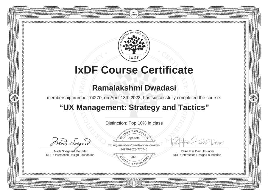 Ramalakshmi Dwadasi's IxDF Course Certificate: UX Management: Strategy and Tactics