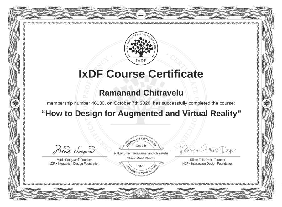 Ramanand Chitravelu's IxDF Course Certificate: How to Design for Augmented and Virtual Reality