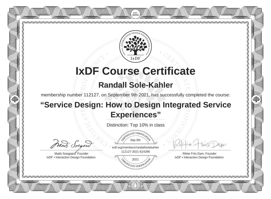 The IxDF Course Certificate above is awarded to Randall Sole-Kahler with a Top 10% Distinction in formal recognition of their coursework surpassing the rigorous benchmarks of exceptional performance established by the IxDF Educational Codex.