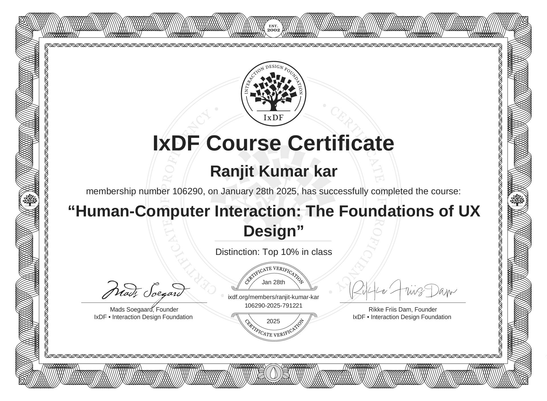 Ranjit Kumar kar's IxDF Course Certificate: Human-Computer Interaction: The Foundations of UX Design