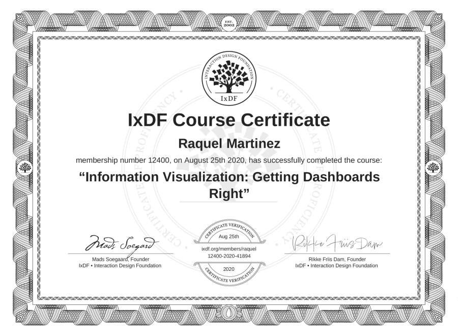 Raquel Martínez's IxDF Course Certificate: Information Visualization: Getting Dashboards Right