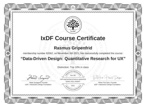IxDF Course Certificates are awarded to Rasmus Gripenfrid in formal recognition of their coursework surpassing the rigorous benchmarks of exceptional performance established by the IxDF Educational Codex.