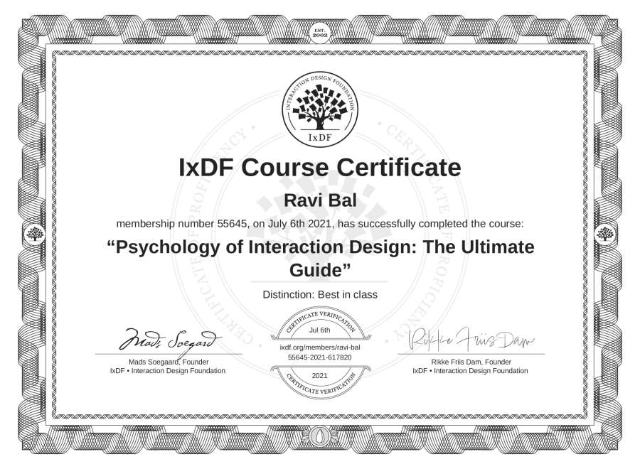 The IxDF Course Certificate above is awarded to Ravi Bal with a Best in Class Distinction in formal recognition of their coursework surpassing the rigorous benchmarks of exceptional performance established by the IxDF Educational Codex.