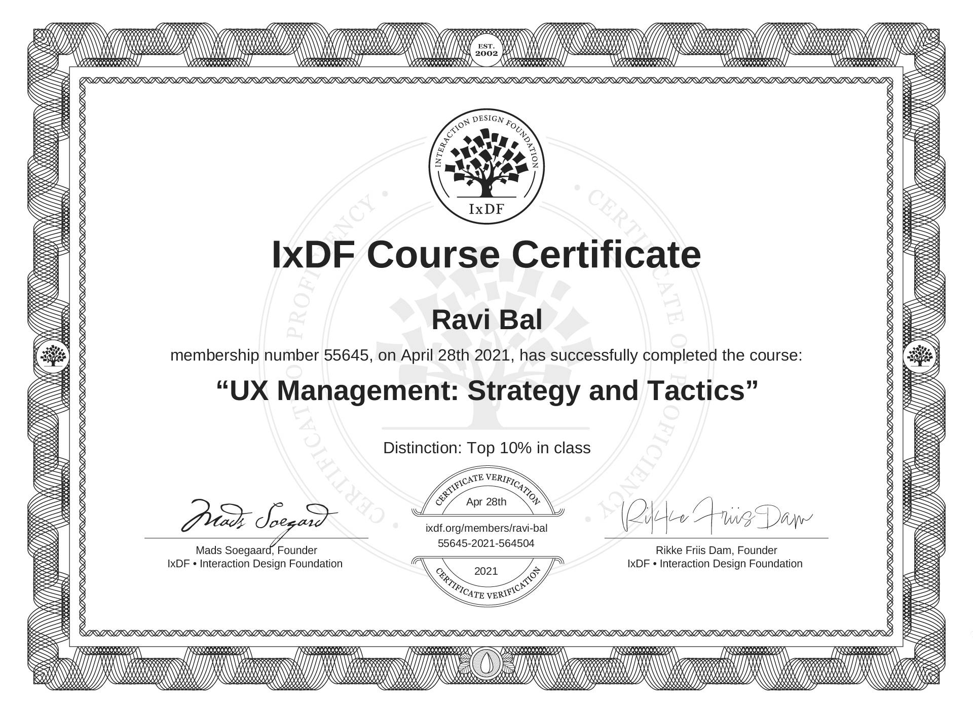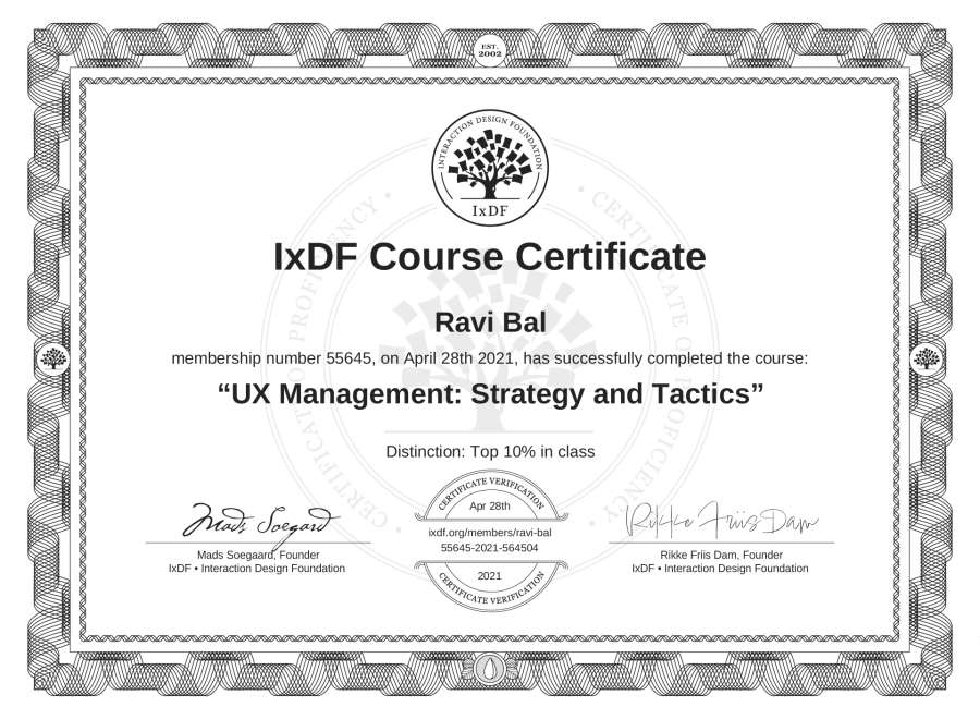 Ravi Bal's IxDF Course Certificate: UX Management: Strategy and Tactics