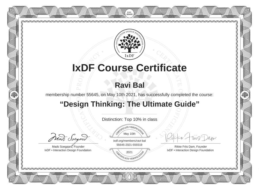 The IxDF Course Certificate above is awarded to Ravi Bal with a Top 10% Distinction in formal recognition of their coursework surpassing the rigorous benchmarks of exceptional performance established by the IxDF Educational Codex.