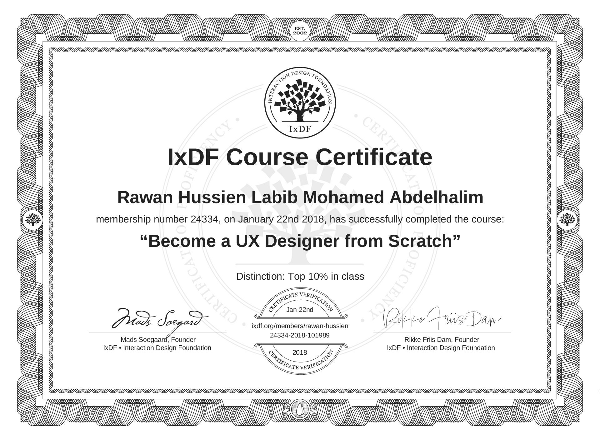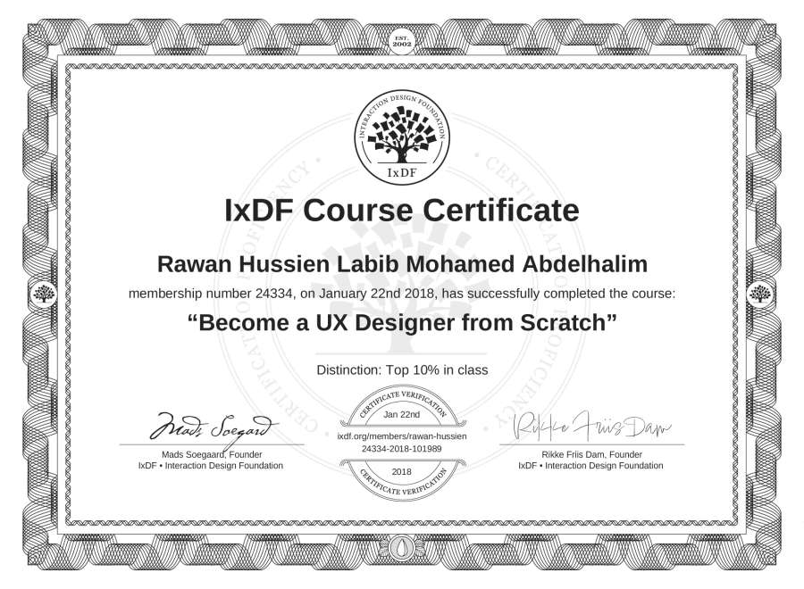 The IxDF Course Certificate above is awarded to Rawan Hussien Labib Mohamed Abdelhalim with a Top 10% Distinction in formal recognition of their coursework surpassing the rigorous benchmarks of exceptional performance established by the IxDF Educational Codex.