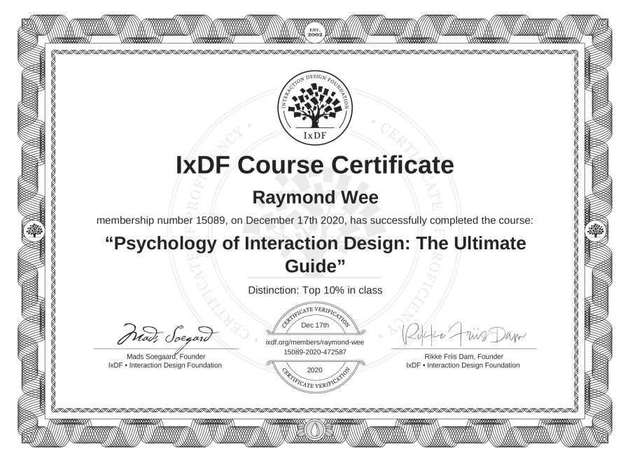 Raymond Wee's IxDF Course Certificate: Psychology of Interaction Design: The Ultimate Guide