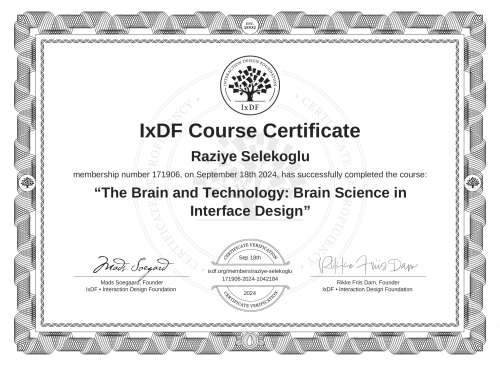 This IxDF Membership Certificate is issued to Raziye Selekoğlu in formal recognition of their membership of the IxDF, global leader in design education.