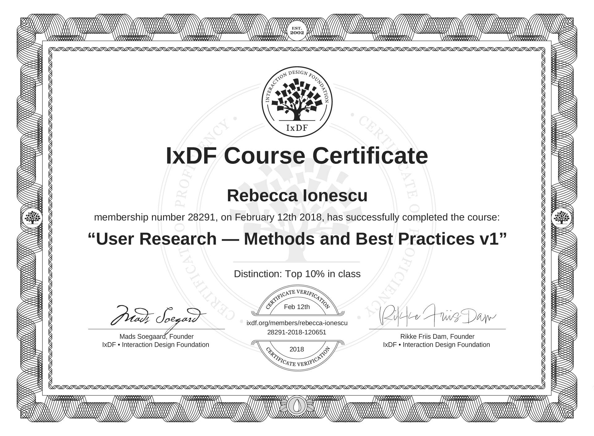 The IxDF Course Certificate above is awarded to Rebecca Ionescu with a Top 10% Distinction in formal recognition of their coursework surpassing the rigorous benchmarks of exceptional performance established by the IxDF Educational Codex.