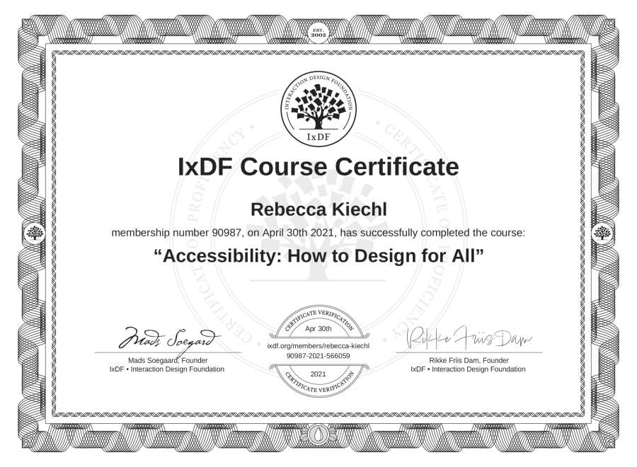 Rebecca Kiechl's IxDF Course Certificate: Accessibility: How to Design for All