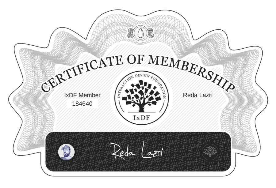The Membership Certificate below verifies that Reda Lazri is a member of Interaction Design Foundation.