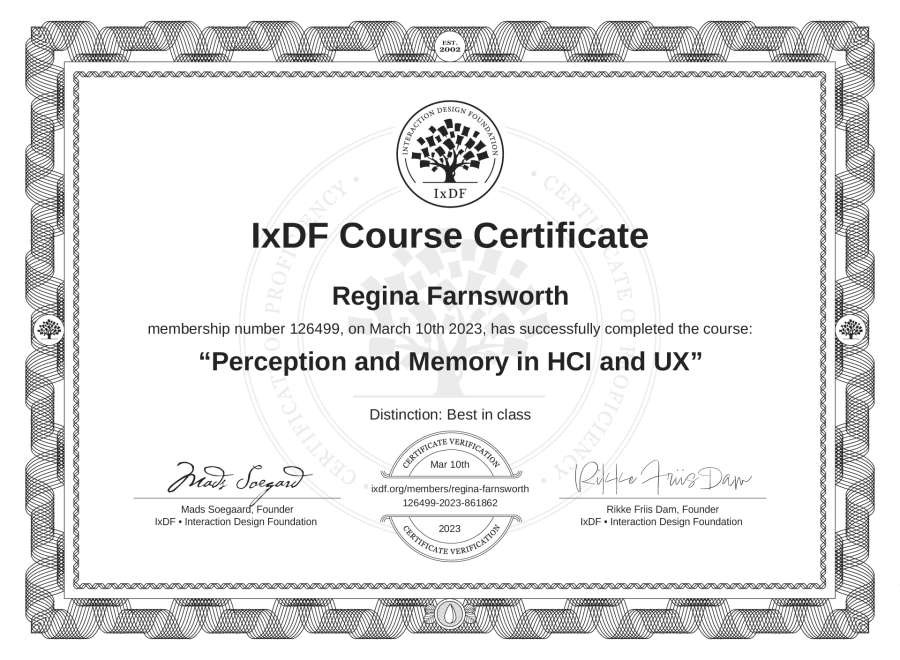Regina Farnsworth's IxDF Course Certificate: Perception and Memory in HCI and UX