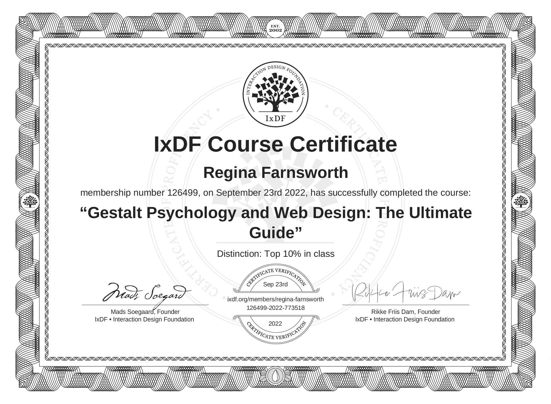 The IxDF Course Certificate above is awarded to Regina Farnsworth with a Top 10% Distinction in formal recognition of their coursework surpassing the rigorous benchmarks of exceptional performance established by the IxDF Educational Codex.