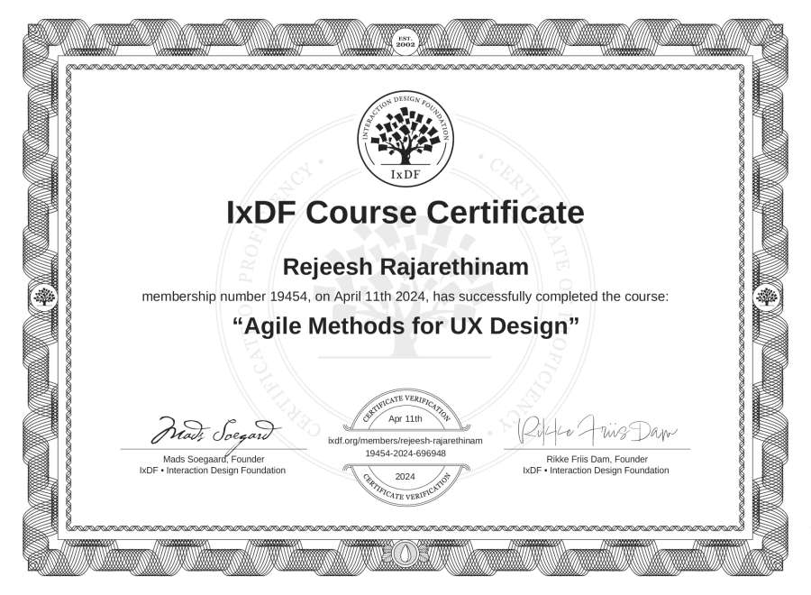 Rejeesh Rajarethinam's IxDF Course Certificate: Agile Methods for UX Design