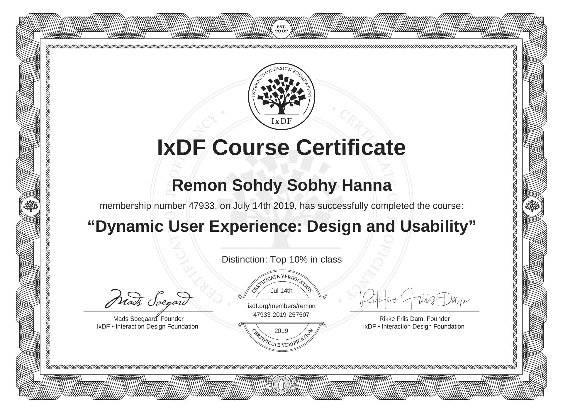 The IxDF Course Certificate above is awarded to Remon Sohdy Sobhy Hanna with a Top 10% Distinction in formal recognition of their coursework surpassing the rigorous benchmarks of exceptional performance established by the IxDF Educational Codex.