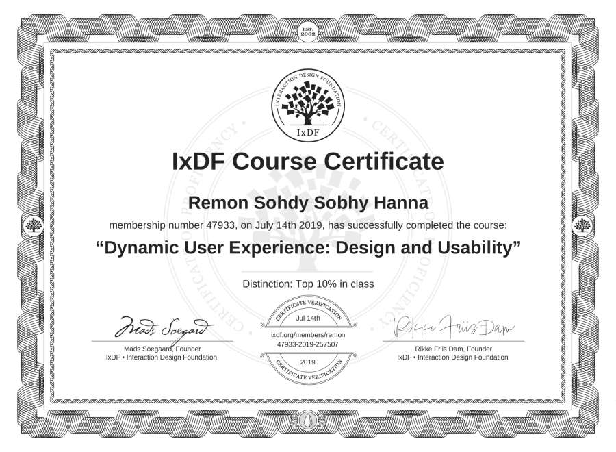 Remon Sohdy Sobhy Hanna's IxDF Course Certificate: Dynamic User Experience: Design and Usability