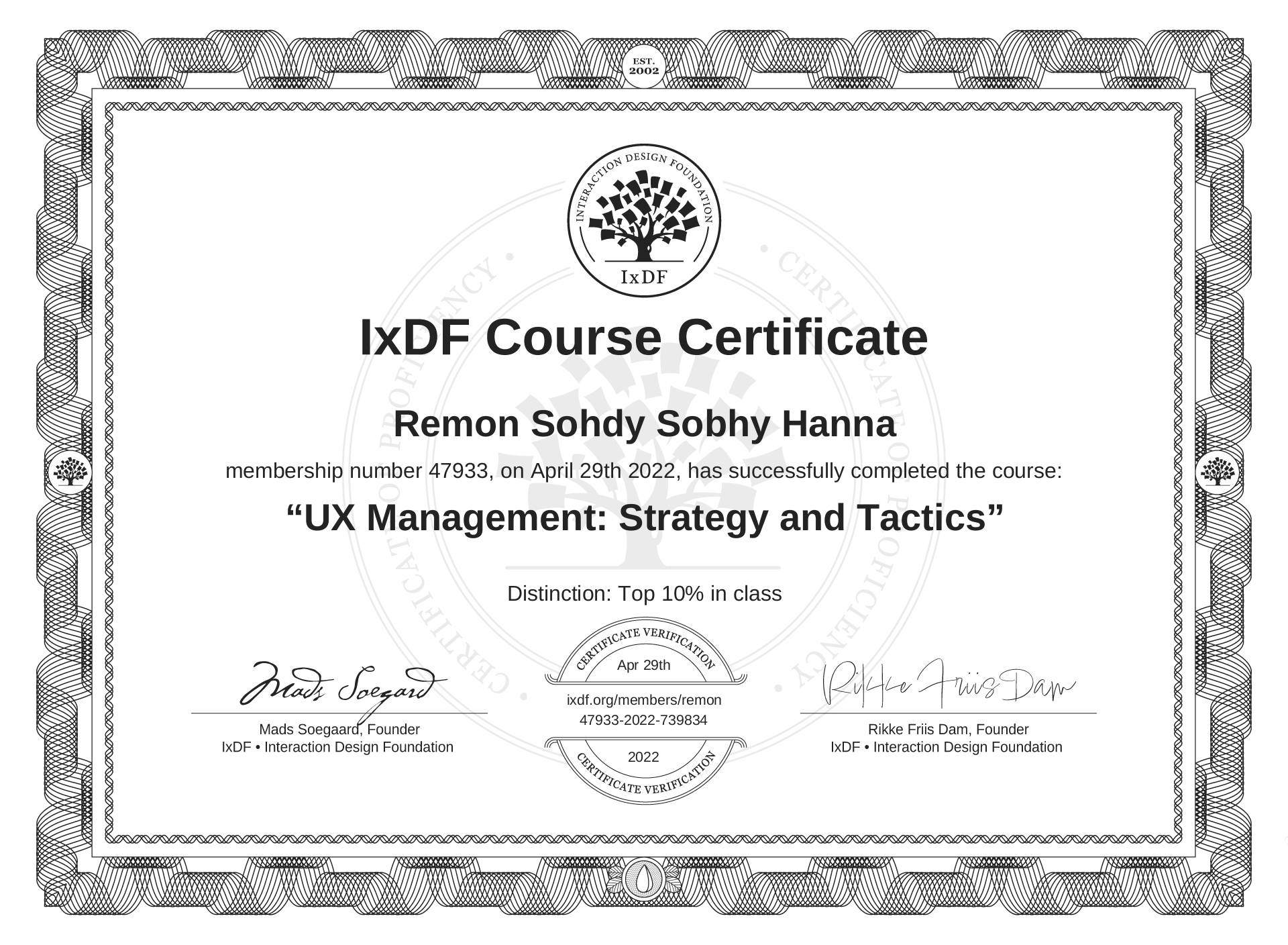 The IxDF Course Certificate above is awarded to Remon Sohdy Sobhy Hanna with a Top 10% Distinction in formal recognition of their coursework surpassing the rigorous benchmarks of exceptional performance established by the IxDF Educational Codex.