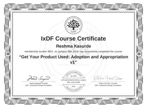 This IxDF Membership Certificate is issued to Reshma Kasurde in formal recognition of their membership of the IxDF, global leader in design education.