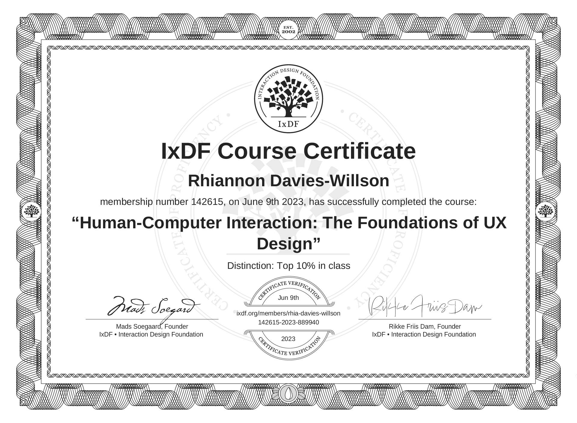 Rhiannon Davies-Willson's IxDF Course Certificate: Human-Computer Interaction: The Foundations of UX Design