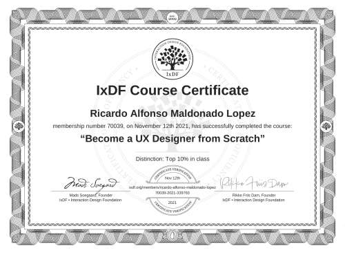 This IxDF Membership Certificate is issued to Ricardo Alfonso Maldonado Lopez in formal recognition of their membership of the IxDF, global leader in design education.