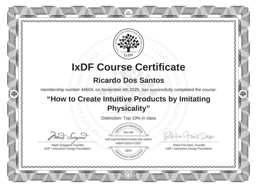 Ricardo Dos Santos's IxDF Course Certificate: How to Create Intuitive Products by Imitating Physicality