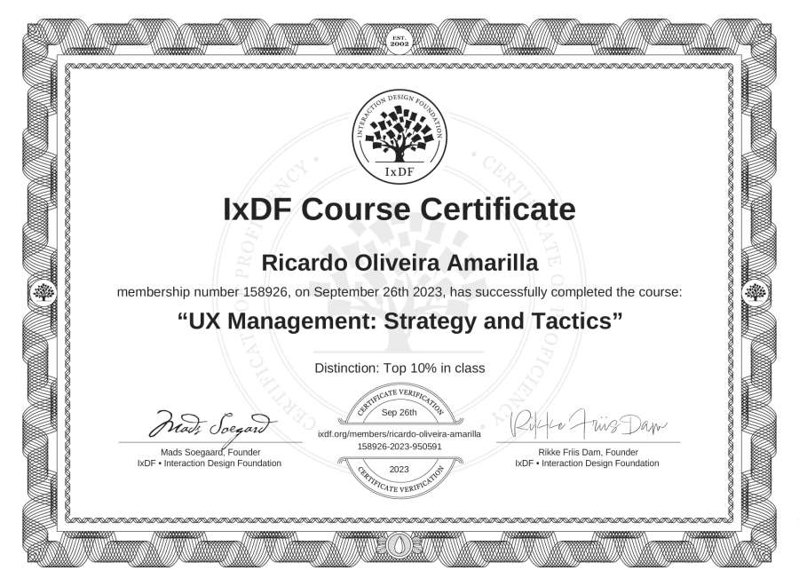 The IxDF Course Certificate above is awarded to Ricardo Oliveira Amarilla with a Top 10% Distinction in formal recognition of their coursework surpassing the rigorous benchmarks of exceptional performance established by the IxDF Educational Codex.