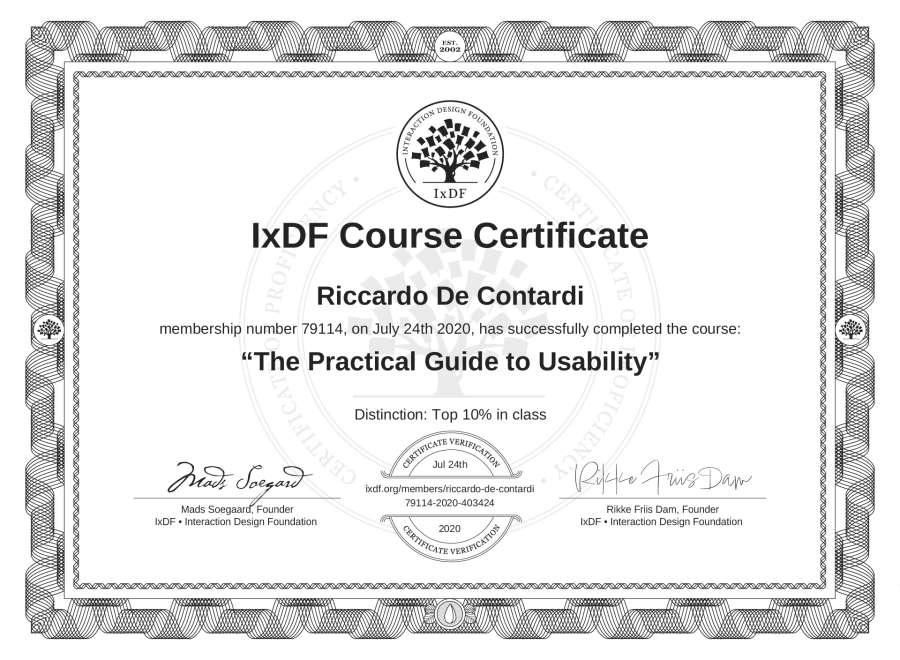 Riccardo De Contardi's IxDF Course Certificate: The Practical Guide to Usability
