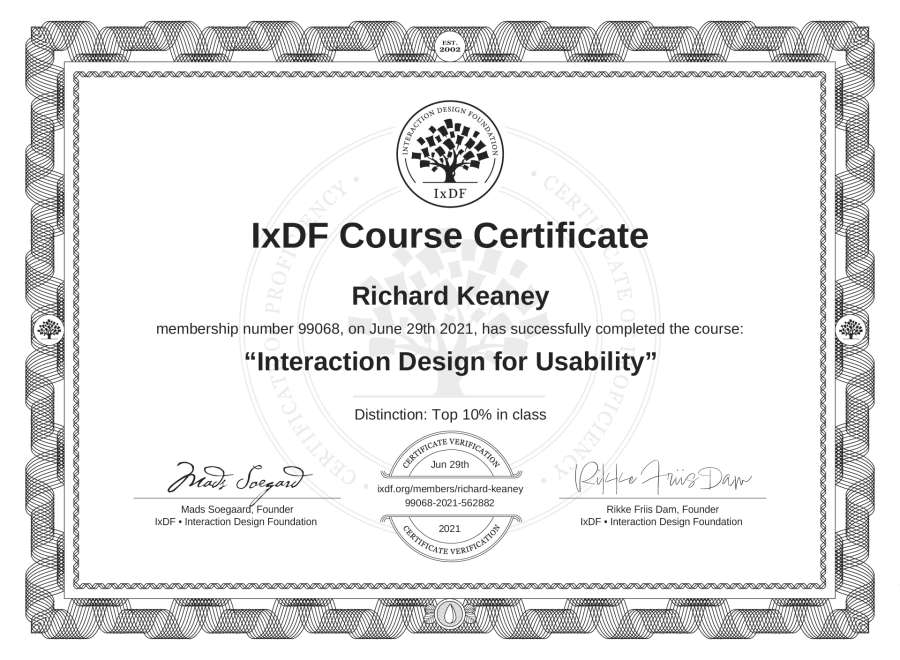 Richard Keaney's IxDF Course Certificate: Interaction Design for Usability