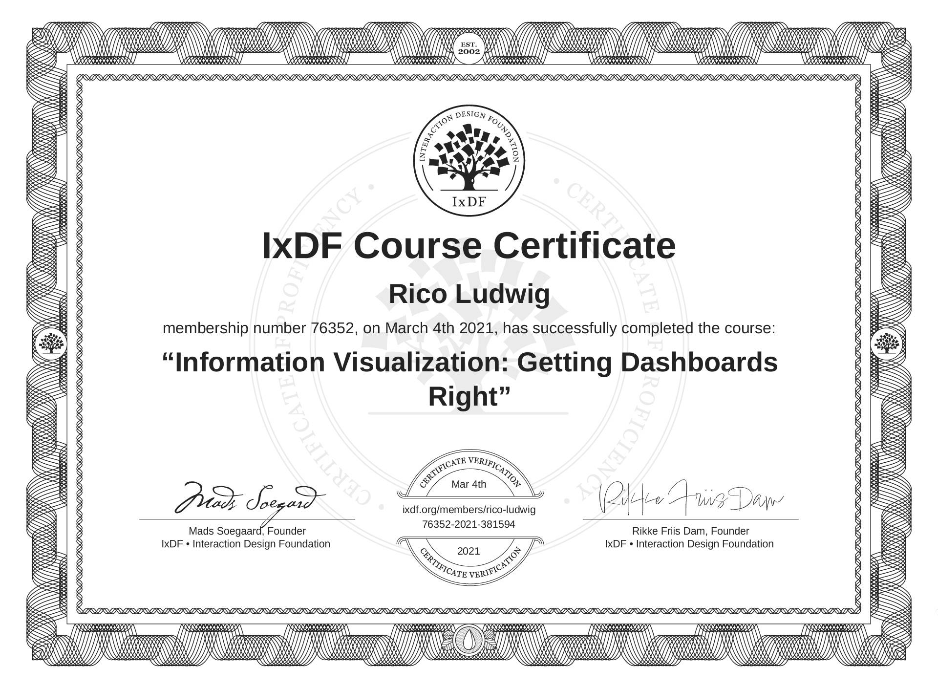 Rico Ludwig's IxDF Course Certificate: Information Visualization: Getting Dashboards Right