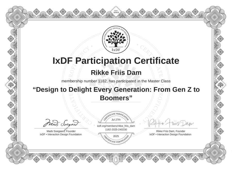Rikke Friis Dam's IxDF Masterclass Certificate: Design to Delight Every Generation: From Gen Z to Boomers