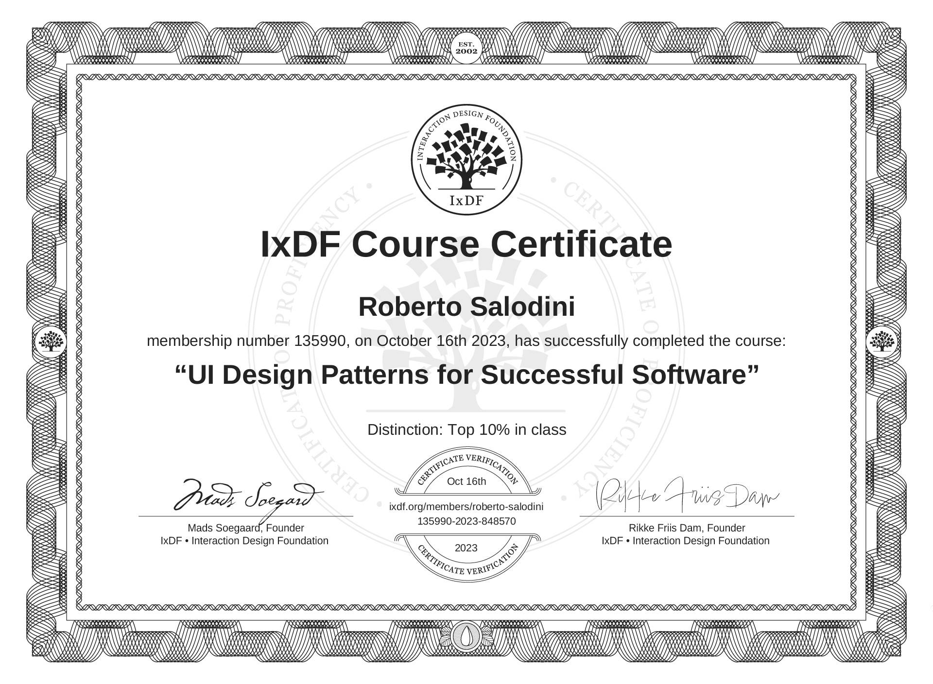 The IxDF Course Certificate above is awarded to Roberto Salodini with a Top 10% Distinction in formal recognition of their coursework surpassing the rigorous benchmarks of exceptional performance established by the IxDF Educational Codex.