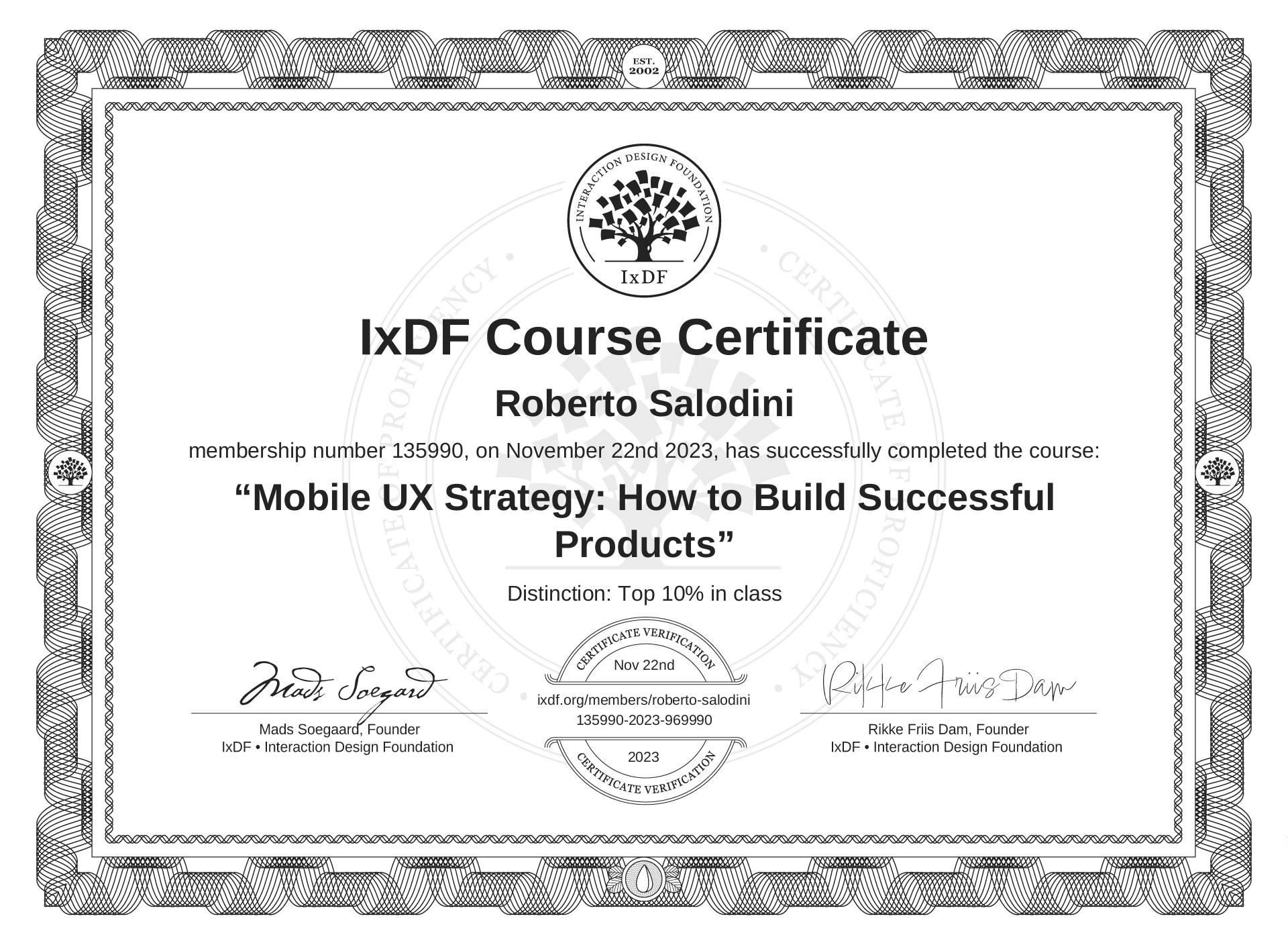The IxDF Course Certificate above is awarded to Roberto Salodini with a Top 10% Distinction in formal recognition of their coursework surpassing the rigorous benchmarks of exceptional performance established by the IxDF Educational Codex.