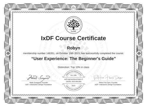 IxDF Course Certificates are awarded to Robyn in formal recognition of their coursework surpassing the rigorous benchmarks of exceptional performance established by the IxDF Educational Codex.