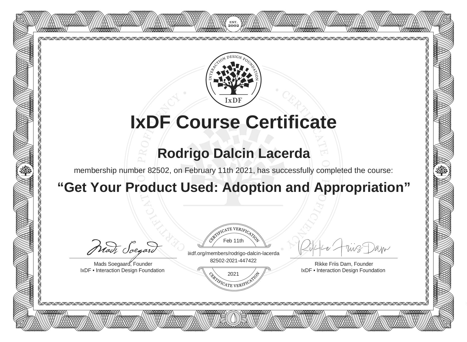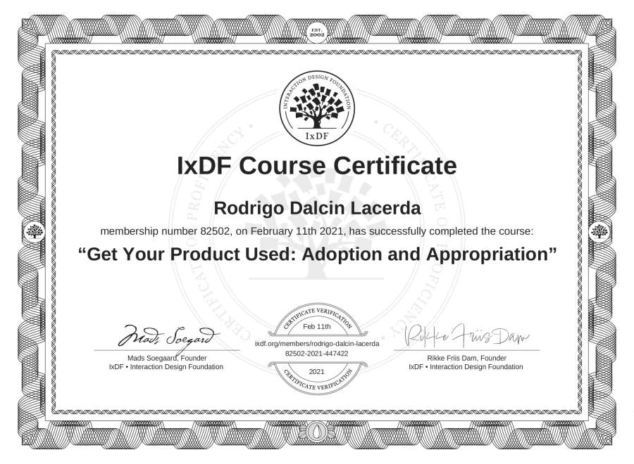 Rodrigo Dalcin Lacerda's IxDF Course Certificate: Get Your Product Used: Adoption and Appropriation
