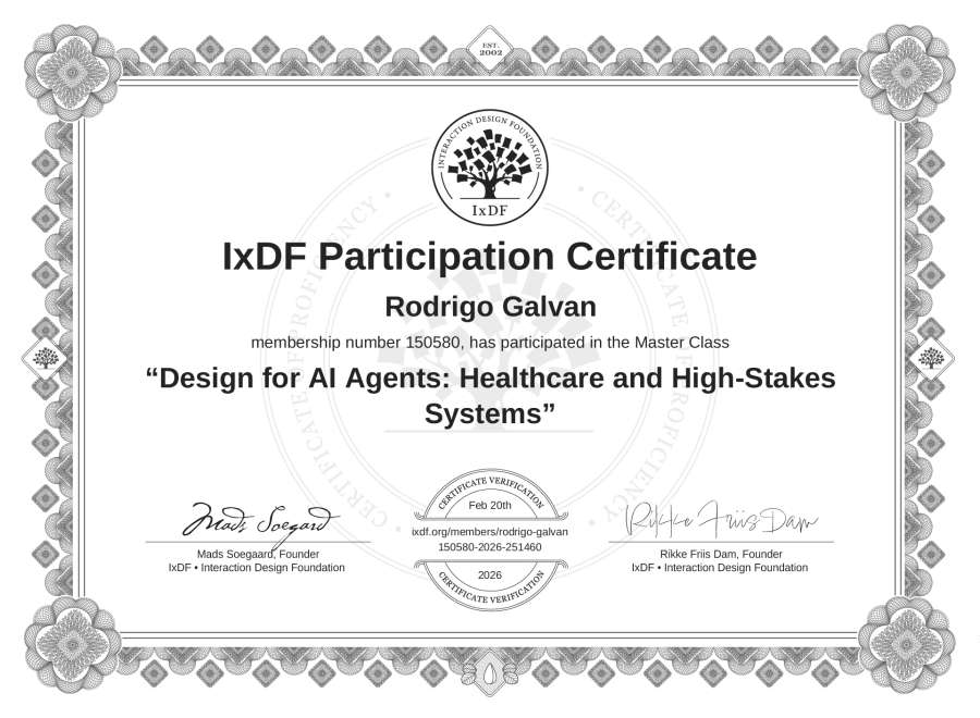 Rodrigo Galván's IxDF Masterclass Certificate: Design for AI Agents: Healthcare and High-Stakes Systems