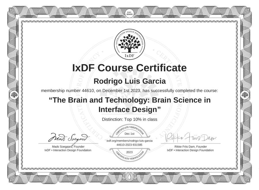 Rodrigo Luis Garcia's IxDF Course Certificate: The Brain and Technology: Brain Science in Interface Design