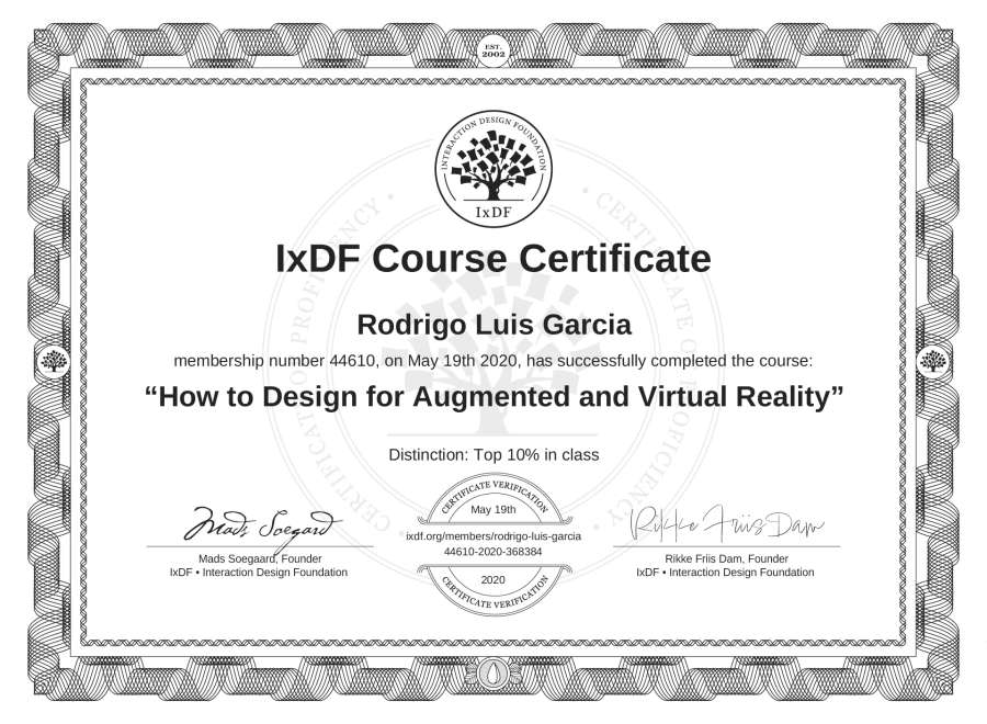 Rodrigo Luis Garcia's IxDF Course Certificate: How to Design for Augmented and Virtual Reality