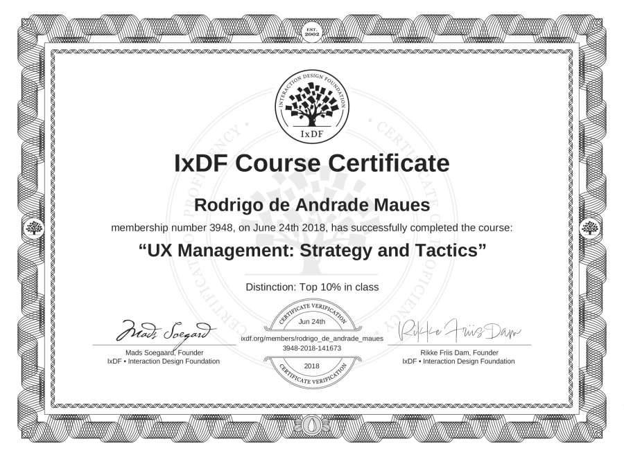 The IxDF Course Certificate above is awarded to Rodrigo de Andrade Maués with a Top 10% Distinction in formal recognition of their coursework surpassing the rigorous benchmarks of exceptional performance established by the IxDF Educational Codex.