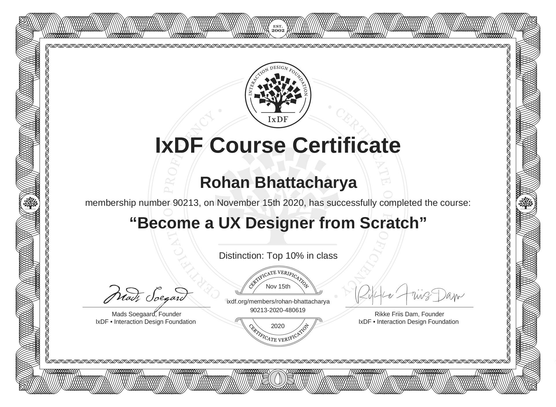 The IxDF Course Certificate above is awarded to Rohan Bhattacharya with a Top 10% Distinction in formal recognition of their coursework surpassing the rigorous benchmarks of exceptional performance established by the IxDF Educational Codex.