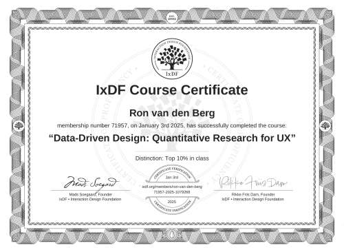 IxDF Course Certificates are awarded to Ron van den Berg in formal recognition of their coursework surpassing the rigorous benchmarks of exceptional performance established by the IxDF Educational Codex.