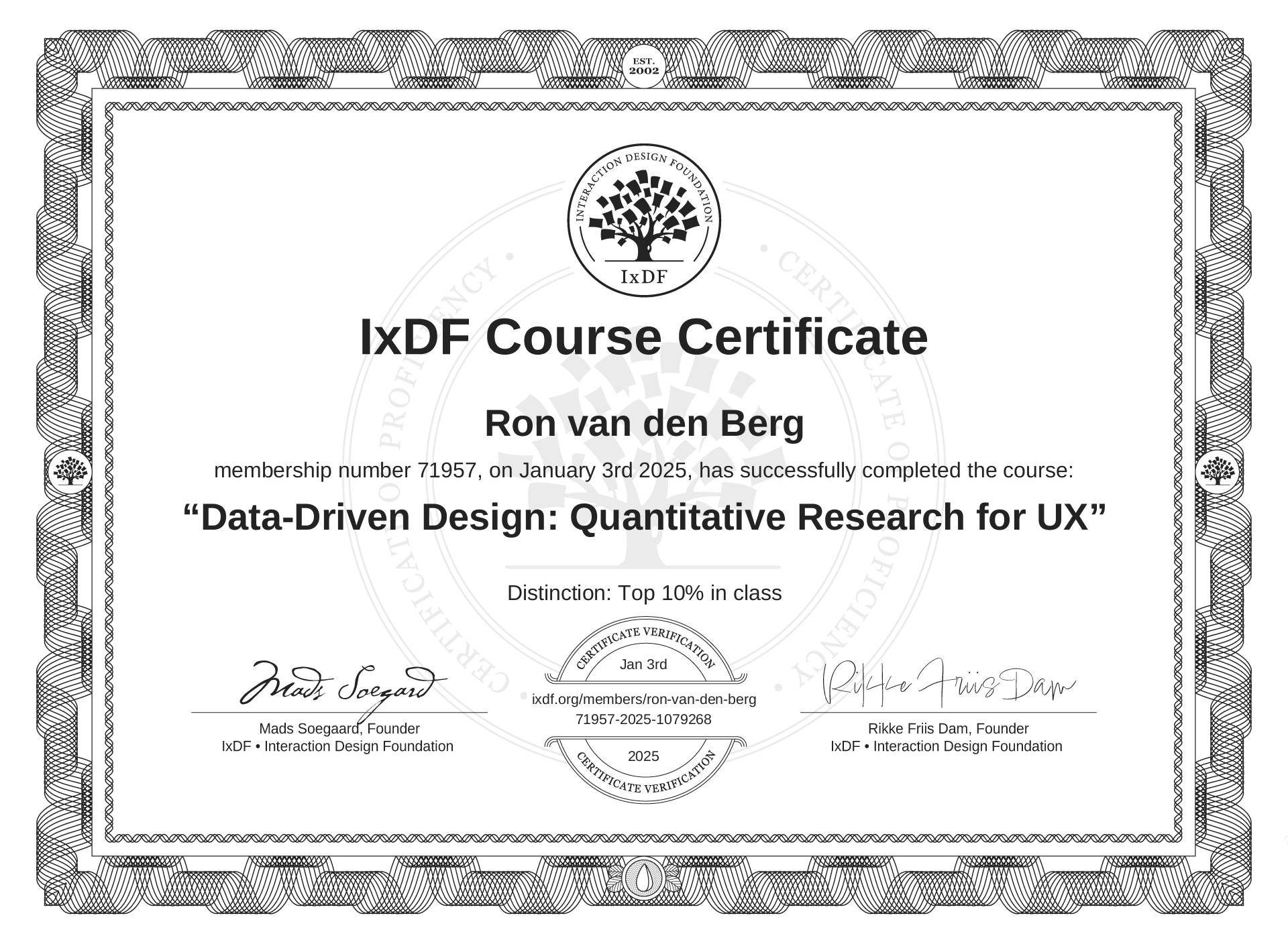 Ron van den Berg's IxDF Course Certificate: Data-Driven Design: Quantitative Research for UX