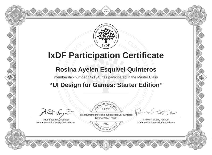 Rosina Ayelen Esquivel Quinteros's IxDF Masterclass Certificate: UI Design for Games: Starter Edition