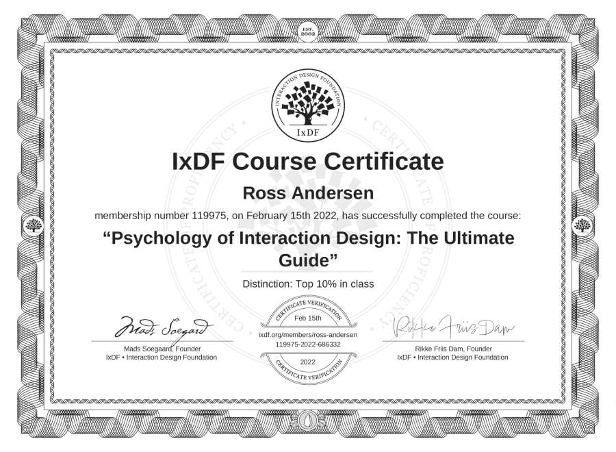 Ross Andersen's IxDF Course Certificate: Psychology of Interaction Design: The Ultimate Guide