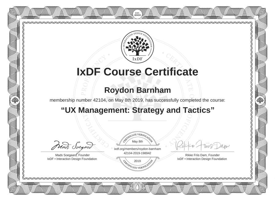 Roydon Barnham's IxDF Course Certificate: UX Management: Strategy and Tactics