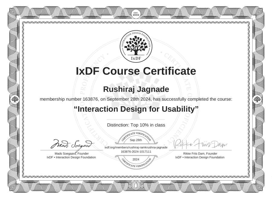 Rushiraj Jagnade's IxDF Course Certificate: Interaction Design for Usability